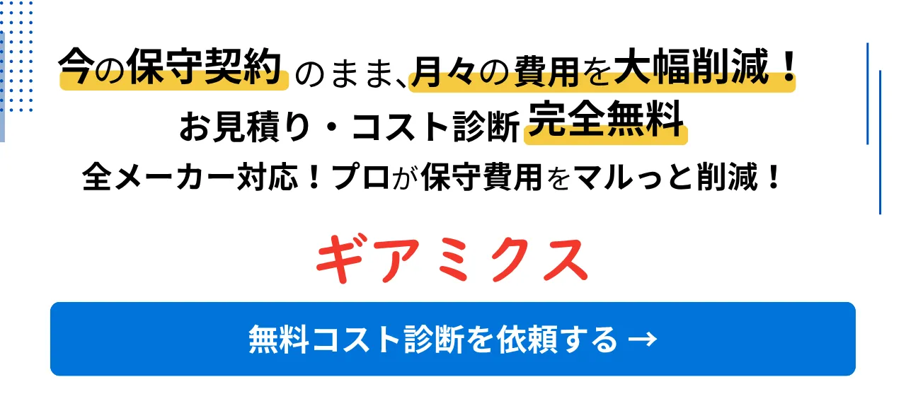 また、エレベーターの管理・保守コストでお困りの方は、全国対応の『ギアミクス』がおすすめです。- メーカー契約のままでも平均30%コスト削減