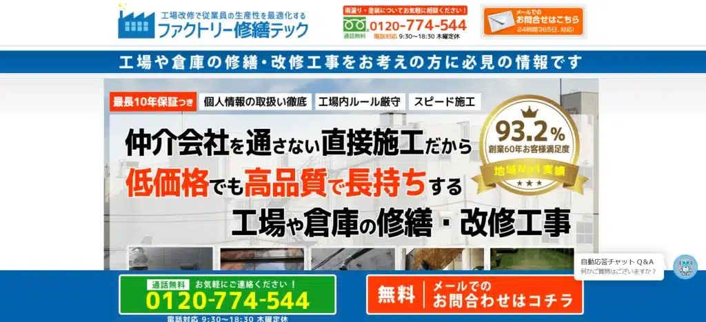 ファクトリー修繕テックは、お客様満足度93.2%を誇る工場や倉庫向けの外壁修繕・改修工事業者です。