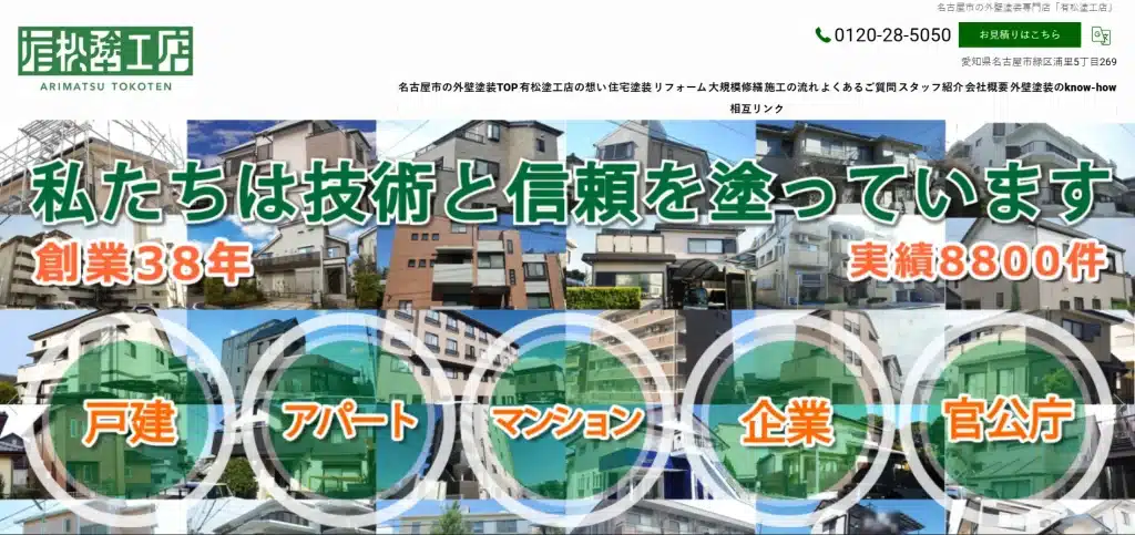 有限会社有松塗工店は、外壁塗装を専門としながら、コンクリート補修や屋根修繕、防水工事まで幅広く対応する施工会社です。