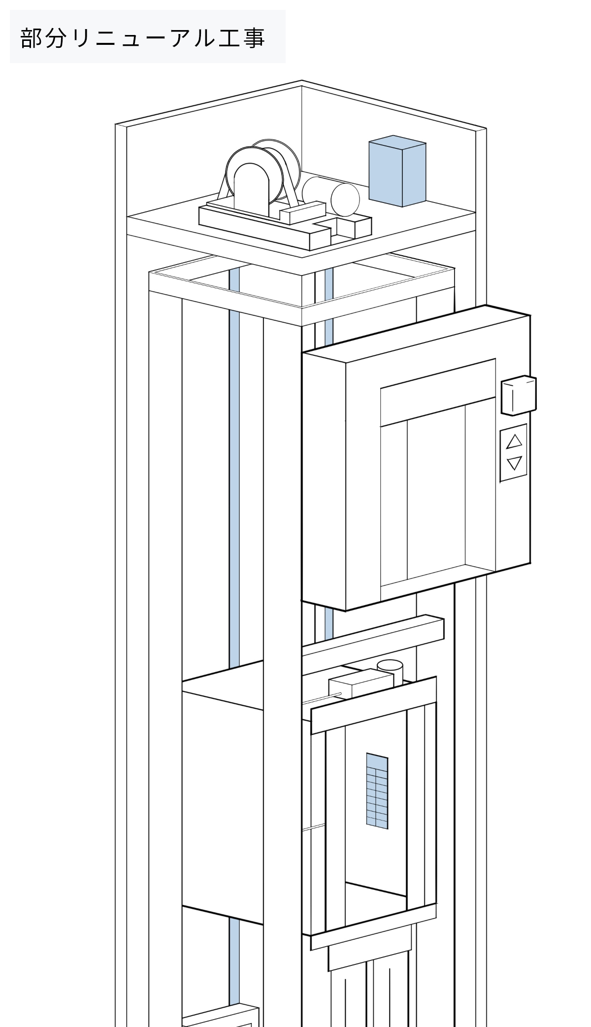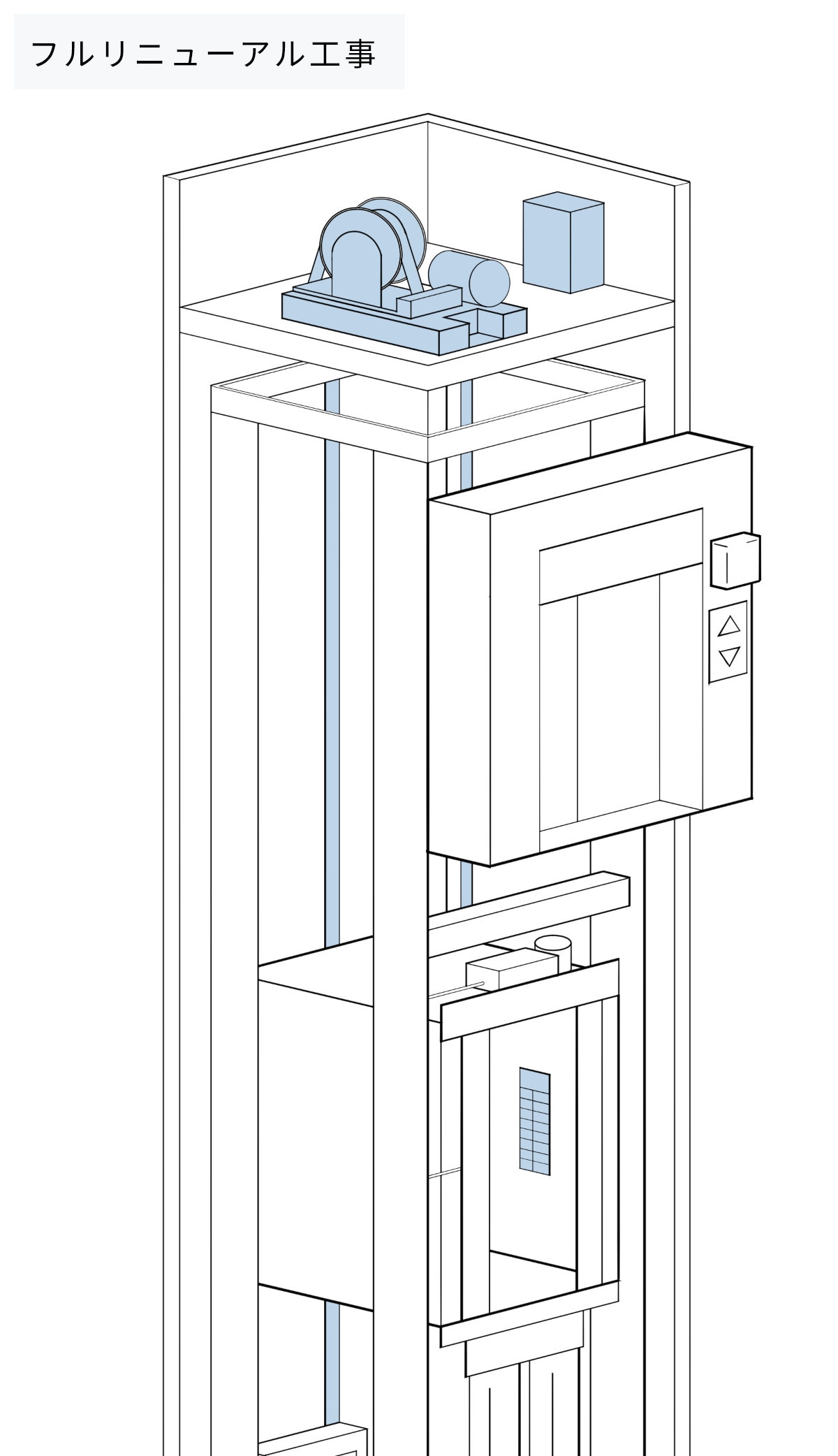 「制御盤」+「巻上機」+「その他(電送系統の付随物)」をすべて交換する工事です。主要部品を全て入れ替える事で、快適な乗り心地と故障のリスクを無くし、安全性を飛躍的に向上させます。